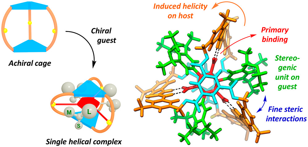 Chirality gearing in an achiral cage through adaptive binding