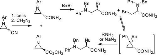 Nitrile and amide biotransformations for the synthesis of enantiomerically pure 3-arylaziridine-2-carboxamide derivatives and their stereospecific ring-opening reactions