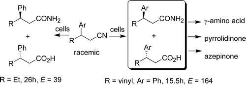 Remarkable electronic and steric effects in the nitrile biotransformations for the preparation of enantiopure functionalized carboxylic acids and amides: Implication for an unsaturated carbon-carbon bond binding domain of the amidase