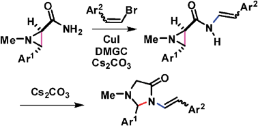 Unprecedented carbon-carbon bond cleavage in nucleophilic aziridine ring opening reaction, efficient ring transformation of aziridines to imidazolidin-4-ones