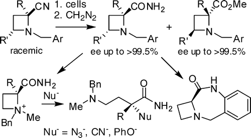 Highly efficient and enantioselective biotransformations of racemic azetidine-2-carbonitriles and their synthetic applications